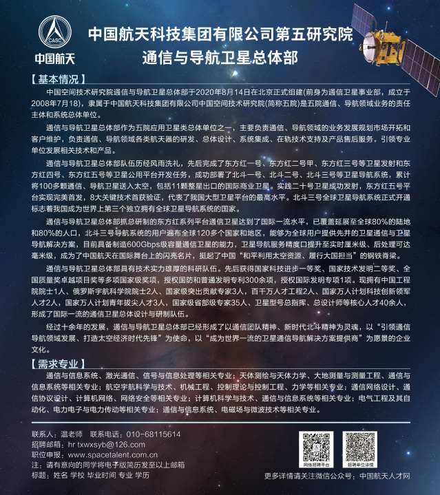 中国航天科技集团有限公司第五研究院通信与导航卫星总体部招聘信息