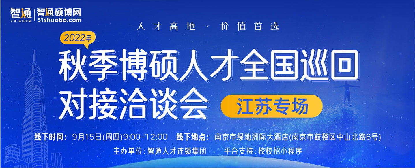 智通人才连锁集团将充分发挥自身平台优势,经过用心筹备,拟定于2022年9月15日组织举办2022年秋季博硕人才全国巡回对接洽谈会(江苏专场)。