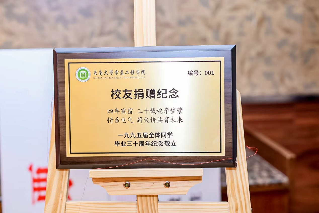 为了助力学院发展,1995届校友率先集体捐资助力学院九龙湖校区工科综合科研大楼建设。在简朴而庄重的捐赠仪式上,随着红绸缓缓揭开,编号“001”的校友捐赠纪念牌正式亮相,标志着1995届校友的集体善举将被母校永久铭记。据悉,工科综合科研大楼位于九龙湖校区西南侧,紧邻一环,批复建筑面积146826平方米,建筑高度约40-60米,地下一层(局部两层),主要建设内容为院系教学、科研、实验及办公用房。校友捐赠将为设施完善提供重要支撑。返校期间,1995届校友同步设立“东大电气校友恩师关爱基金”,彰显了校友们对恩师教诲的感恩之情。