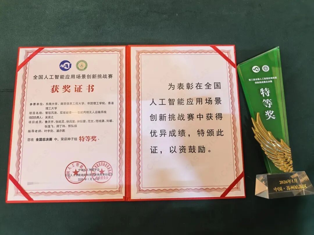 大赛以“场景驱动·数智强国”为主题,在科学技术部战略规划司指导支持下,由中国人工智能学会(CAAI)主办,旨在把握全球科技革命和产业变革趋势,深入推进创新驱动发展战略和“人工智能”行动计划。自启动以来,大赛共吸引来自国内外重点高校、科研机构和科技企业的3314支队伍参赛。其中,东大叶宇剑教授团队的智能两栖无人运输系统项目在功能实现、技术成熟度和应用场景创新等方面均表现突出,荣获全国总决赛特等奖(高校种子组全国仅5项),并入选“全国人工智能应用场景典型案例”,叶宇剑教授同时获评“优秀指导老师奖”。